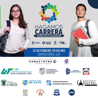 Con el propósito de ampliar el abanico de oportunidades profesionales para que las y los egresados de bachillerato y preparatoria elijan la institución en la que cursarán su carrera universitaria, se llevará a cabo la segunda Feria de Universidades "Hagamos Carrera" el próximo 23 de febrero a las 10:00 horas en la explanada del Centro Cívico del municipio de San Juan del Río.